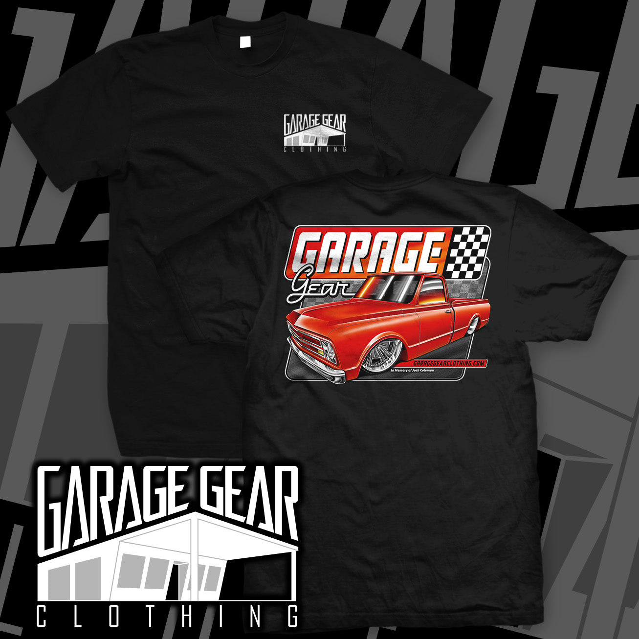 Red C10 truck design is located on the back and the small Garage Gear logo is located on the front. Tee is printed on a black tee.
